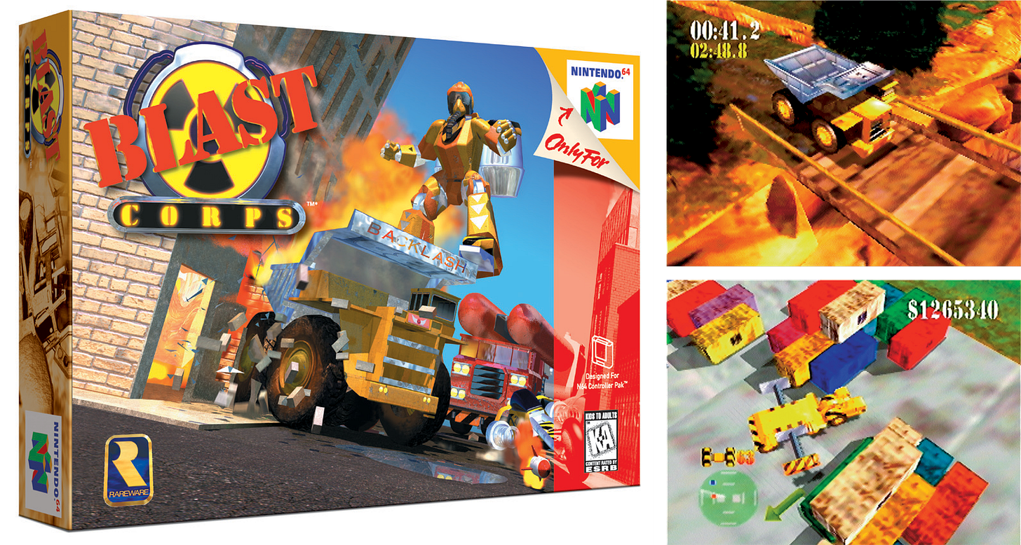 Di Blast Corps mi occupai per Game Power, un mensile specializzato tra i primi a essere dedicati ai videogiochi per console in Italia. Non mi divertii granché con quel gioco di Rare1, lo trovi tutto sommato poco più che sufficiente e pronto per essere scordato (cosa che effettivamente avvenne, per un bel pezzo). Il mio voto finale fu di 67/100. In Blast Corps l’obiettivo era distruggere tutto mentre ci si muoveva in un ambiente tridimensionale ai controlli di veicoli pesanti di vario tipo, come una ruspa o un camion. Quest’idea, non esattamente mainstream, venne messa in scena in maniera competente ma non proprio stupefacente. Blast Corps, insomma, non mi sembrò essere fatto della stessa pasta di Super Mario 642 e neppure di quella di altri giochi per il Nintendo 64 come Pilotwings 64 e Wave Race 64, tutti realizzati direttamente dagli studi di Nintendo. Da appassionato che aveva venduto la sua intera collezione di videogiochi per potersi permettere un Nintendo 64 importato dal Giappone solo pochi mesi prima, vissi Blast Corps scosso da ripetute ondate di noia e delusione.