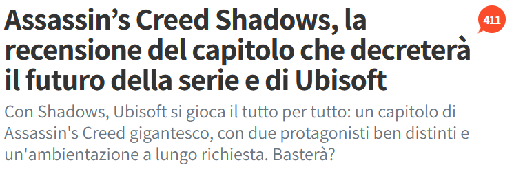 A tutto questo ho pensato mentre leggevo i titoli e poi i pezzi dedicati in questi giorni ad Assassin’s Creed Shadows, pubblicato da Ubisoft per PC, PlayStation 5 e Xbox Series X|S. Scusate, sono stato impreciso: “mentre leggevo le recensioni di Assassin’s Creed Shadows”. Il gioco fa parte di una serie di straordinardio successo e arriva nel momento più complicato dell’intera storia del suo editore3. Se non ne sapete nulla o credete di non saperne abbastanza, Il Post ha pubblicato un riassunto della situazione4 e messo in ordine i motivi per cui Assassin’s Creed Shadows ha un peso specifico differente.