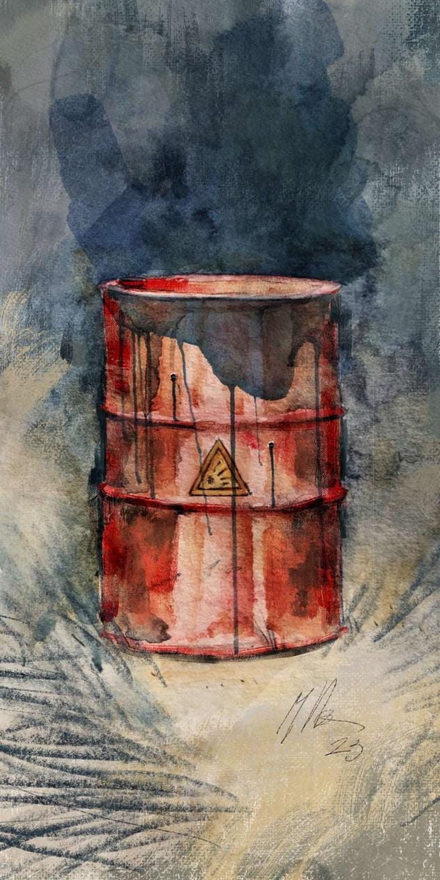 Il barile esplosivo che apre questa newsletter è di Alessandro Manzella, uno molto bravo.