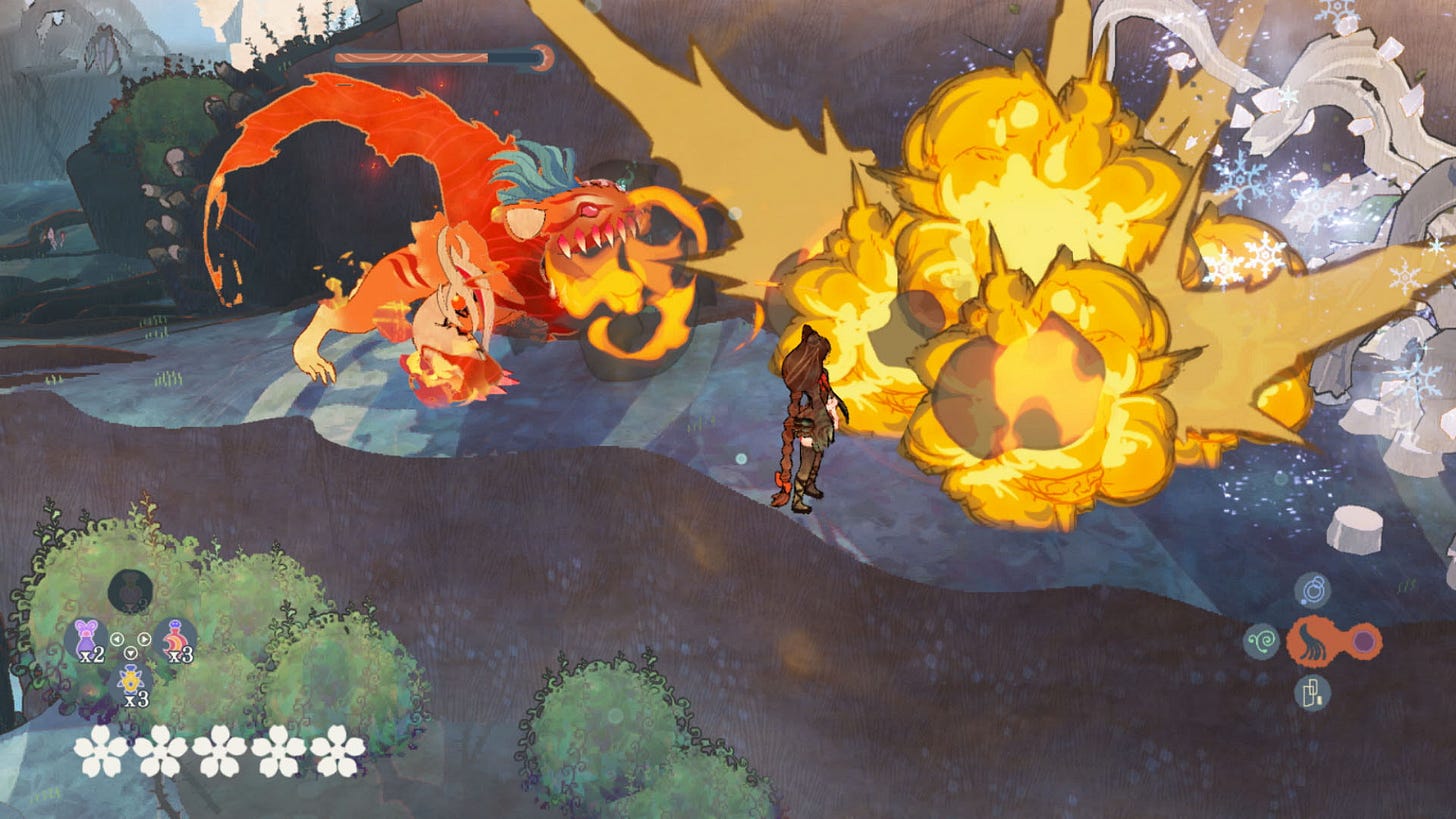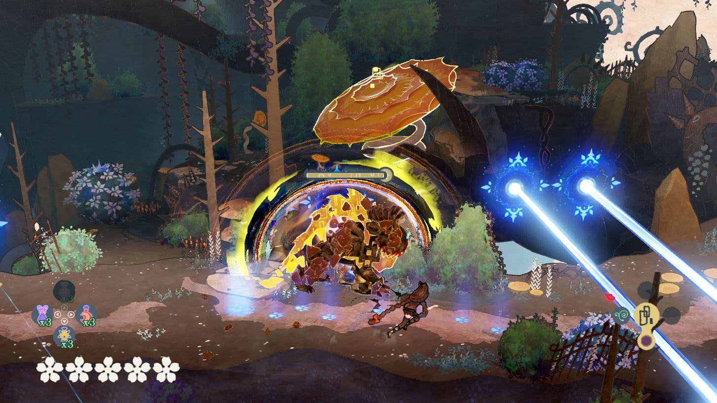 Bayonetta Origins simultaneously puts you in control of both Cereza and her demon-infused cat plushie, Cheshire, when summoned — Cereza’s movement and actions are dedicated to the left side of the controller and Cheshire to the right. Juggling two characters eventually became quite intuitive once I got the hang of it, but I found both the system itself and the challenges it’s used for don’t evolve drastically after being established.