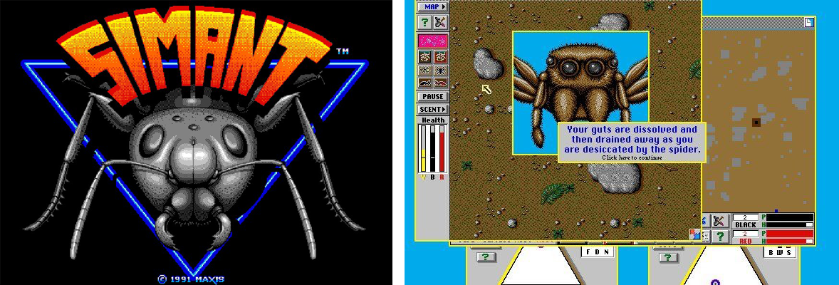 SimAnt è infatti il terzo gioco della Maxis dopo Sim City e Sim Earth ed è un vero e proprio simulatore di colonia di formiche. Una scelta folle ma perfettamente in linea con Wright e con il momento creativo degli anni ‘90. Come se i Nirvana dopo Bleach e Nevermind invece di In Utero avessero pubblicato un disco di musica per ascensore, tanto per vedere come va. L’obiettivo finale è colonizzare tutto il giardino, entrare in casa e mandare via l’umano che ci abita combattendo contro le formiche rosse, la pioggia, le termiti, gli insetticidi e i temibili ragni. Ecco, parliamo di come il gioco ti mostra la tua morte per mano di un ragno (o forse sarebbe meglio dire “per cheliceri di un ragno”?)... Descrivendo il tuo corpo che si scioglie lentamente. Signor Wright questo sarebbe un gioco educativo per bambini?
