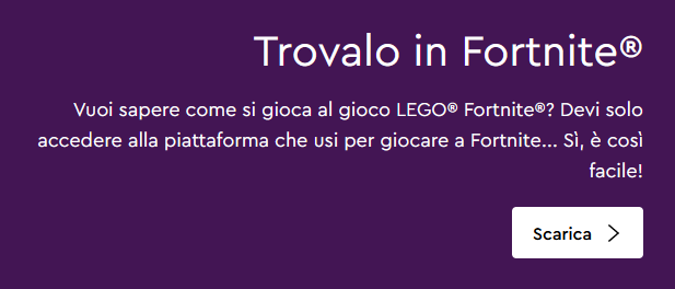 Sul sito istituzionale di Lego, nella pagina dedicata a LEGO Fortnite, la formula è un po’ diversa ma proprio di poco, “Trovalo in Fortnite”:
