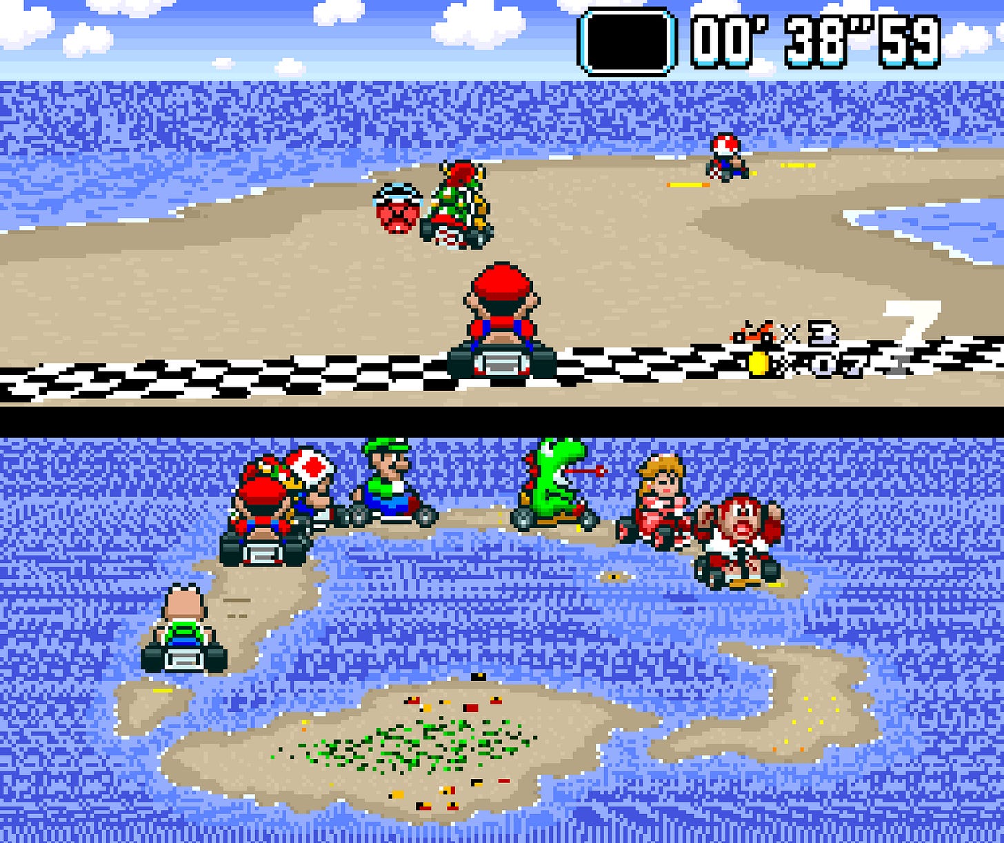 Super Mario Kart arriva a rappresentare l’ultimo grido in fatto di uso del bitmap, e la sua varietà ne fa un incontestabile capolavoro.