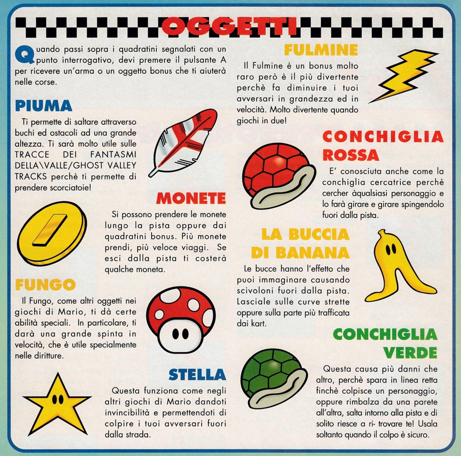 La pubblicazione ufficiale Club Nintendo, curata per alcuni anni anche in Italia direttamente da GiG, realizzò per l’uscita del gioco una presentazione su più pagine. Non era ancora tempo di traduzioni in italiano e di canoni da rispettare, così l’elenco degli oggetti da utilizzare in gara finì per includere le conchiglie verdi e le conchiglie rosse.