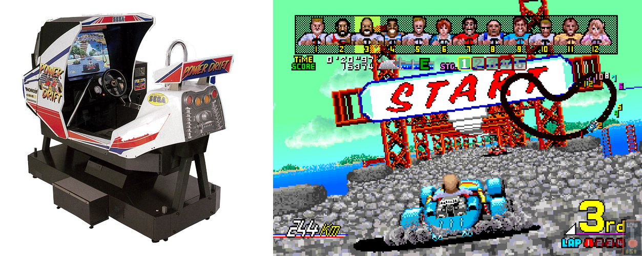Power Drift onora la tradizione dei giochi taikan di Sega presentandosi nelle sale giochi all’interno di un mobile riccamente decorato, con tanto di sedile e parti semoventi che assecondano l’azione sullo schermo. A dirigere l’orchestra non poteva che essere Yu Suzuki, di nuovo. L’autore di Out Run, Hang-On e After Burner, leader del team Am2, questa volta libera le lingue d’asfalto dai vincoli terreni e costruisce un gioco di guida i cui tracciati sembrano arrivare fino in cielo. Salite ardite e discese a rotta di collo, in cui un nuovo sistema di inquadrature si gode movimenti più dinamici e suggestivi del solito. E a venire sbalzati fuori durante l’ennesimo curvone a gomito sono anche i limiti di tempo: in Power Drift va avanti solo chi si classifica entro le prime tre posizioni.