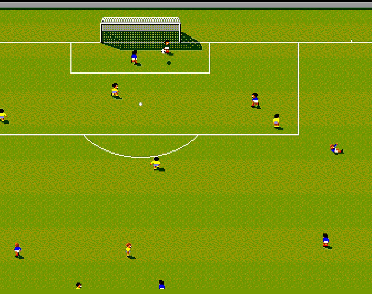 Sensible Soccer è uno sparatutto su un campo verde, un flipper con quattro pixel bianco/neri di pallina, un gioco di guida con ventidue minuscole automobili in modalità autoscontro. La velocità del gioco surclassa la concorrenza istigando paragoni con altri generi più arditi di un gol in finale di Galia e l’immediatezza del sistema di controllo rende finalmente evidente ai frequentatori della chiesa di Anco che il loro è un dio pagano. Riducendo Ruud Gullit e Maradona a pochi pixel, Sensible Soccer spiega (senza rendersene conto) cosa si intende con “pixel art”: ogni quadratino conta.