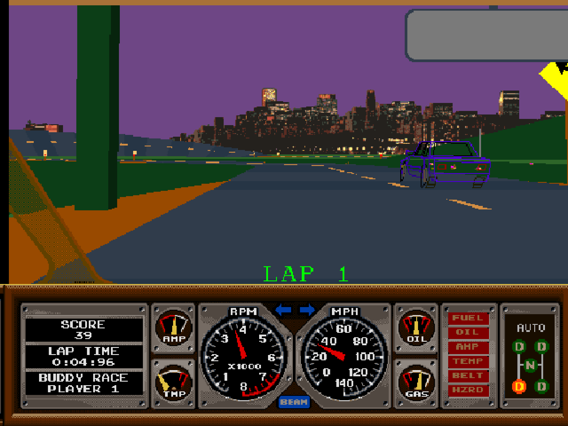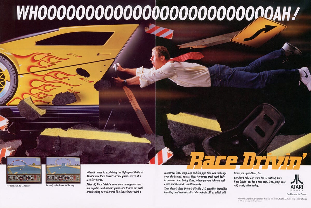 Debutto: arcadePrima di cominciare a giocare dovrete accendere l’auto girando la chiave, il volante vibra e oppone resistenza quando finite nell’erba e la leva del cambio vi obbliga a gestire le sue quattro posizioni con precisione e tempismo: Race Drivin’ è un vero simulatore e il degnissimo seguito dello spettacolare Hard Drivin’ di un anno fa.
