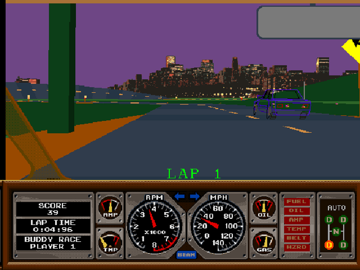 Tutti gli elementi sono in 3D e la velocità è più convincente rispetto al primo gioco della serie. Atari ha anche aggiunto due piste e una modalità per due giocatori, che possono alternarsi alla guida per provare a battere il tempo dell’altro. Non c’è niente all’altezza di Race Drivin’, nei videogiochi da casa!