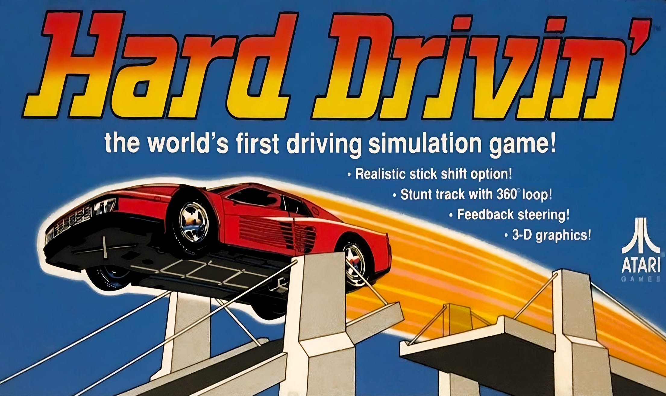 Debutto: arcadeSe non avete visto Hard Drivin’, potreste non credere ai racconti di chi lo ha fatto. Atari se ne è venuta fuori con un miracolo di tecnologia, un gioco di guida tutto 3D, ospitato dalla riproduzione del muso di un’auto, dentro cui ci si siede per affrontare giri della morte, salti e accelerazioni spettacolari. Cercate una sala giochi, individuate la coda di chi attende con il gettone in mano e non scordate un frontale con la mucca poligonale!