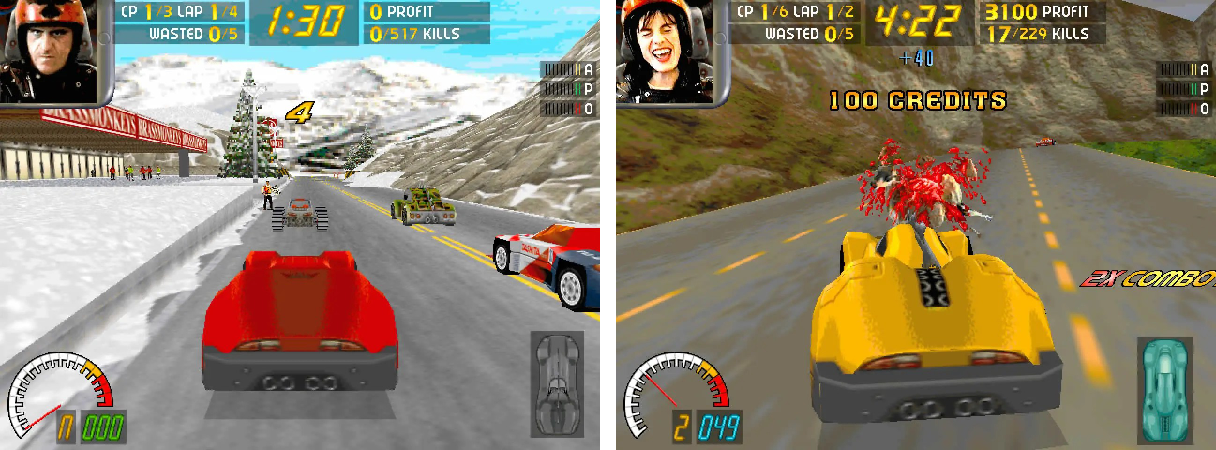 Debutto: PC SCi spinge verso l’infinito e oltre il concetto di violenza gratuita. Lo fa con Carmageddon, geniale nella scelta del titolo e meno illuminato in quella dell’idea di gioco. Che comunque, che piaccia o meno, funziona. Carmageddon è un gioco di corse, con decine di percorsi da attraversare e un tempo limite per farlo. Un gioco in cui l’unico modo per guadagnare secondi extra e rimandare il fallimento è distruggere le auto avversarie, andare addosso a dei barili… ma anche mettere sotto i pedoni che popolano le città tra le cui vie il giocatore (e gli altri concorrenti) seminano il terrore. Se si riesce a falciare qualche poveretto con un movimento particolarmente coreografico, come una derapata, ancora meglio: più punti!