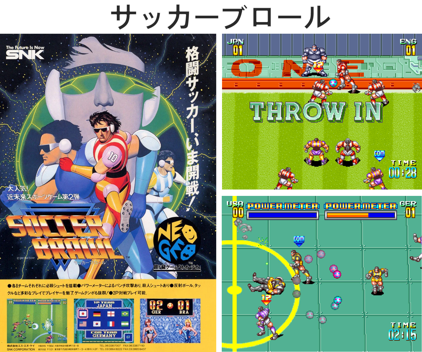 Debutto: Neo Geo (SNK)Soccer Brawl è il calcio del futuro. Gli atleti sono protetti da armature e potenziati da tecnologie prepotenti, le arene sono metalliche e lucenti, l’arbitro pressoché ininfluente e la grafica travolgente. SNK ha fatto passi da gigante e il suo nuovo esperimento a base di soccer è di tutt’altro livello rispetto a quelli del passato. Le squadre che partecipano al torneo sono otto e vengono suddivise a coppie a seconda della natura di un super tiro a cui possono appellarsi per confermare o ribaltare il risultato.