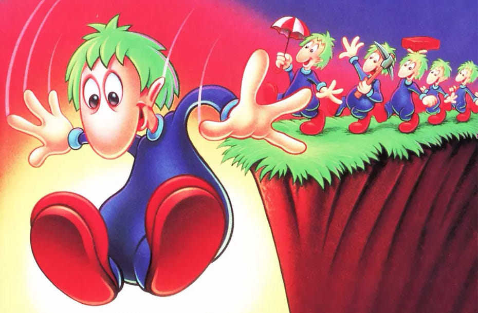 Debutto: Amiga (Commodore)Lemmings è un gioco sviluppato dalla software house scozzese DMA Design e pubblicato dall’inglese Psygnosis, quest’ultima abituata ad apporre il suo marchio con l’effige della civetta su un invidiabile numero di giochi di successo (molti ricordati nei libri di Storia dei videogiochi). Prima di Lemmings, DMA Design è conosciuta per due sparatutto strutturalmente molto ordinari, tutto ciò che non è Lemmings. Che invece stupisce con un’idea ridicola sulla carta e perfetta sullo schermo: mettere in salvo una schiera di minuscoli roditori pixellosi, gestendone i ruoli e costruendo così un gioco gestionale come non se ne erano mai visti prima.