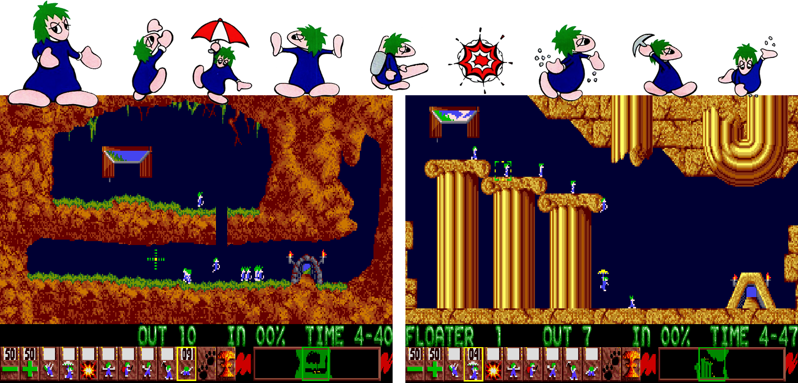 Le bestioline venno accudite e istruite, attraverso i compiti che gli si possono assegnare per far sì che il maggior numero di loro riesca a raggiungere l’uscita. Qualcuno può scavare un tunnel, creando un passaggio per il resto della tribù, altri possono bloccare la strada per evitare che i compagni si muovano verso morte certa. C’è anche l’ombrello per calarsi dolcemente da altezze altrimenti letali o il piccone per sbriciolare l’ambiente di gioco.