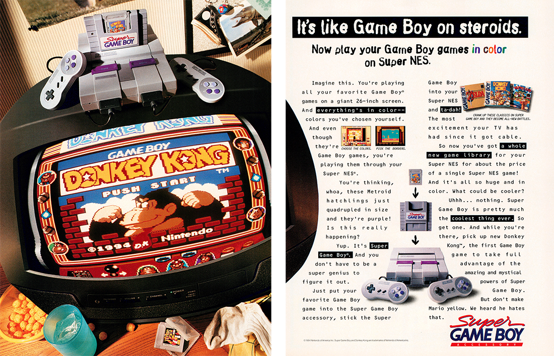 Donkey Kong fu il primo gioco a sfruttare le capacità del Super Game Boy, l’adattatore che rendeva possibile utilizzare le cartucce del Game Boy sul Super NES e quindi visualizzare i giochi sul televisore. Il Super Game Boy aveva infatti la capacità di sostituire le poche gradazioni di verde-grigio pensate per lo schermo monocromatico della console-a-mattonella, con dei colori veri e propri. /