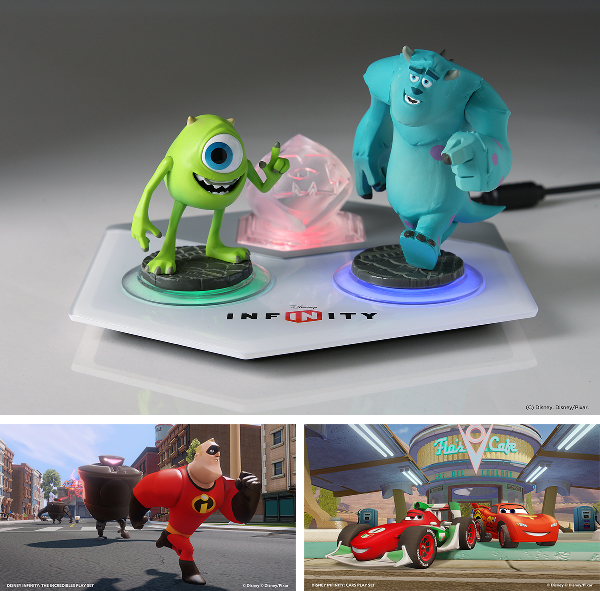Quando è pronto per i negozi, Disney Infinity viene consegnato in una grande confezione con un portale su cui appoggiare almeno una delle quaranta statuette vendute separatamente. O degli oggetti e dei mondi di gioco, anche loro da acquistare a parte. Nello Starter Pack, la grande confezione di cui sopra, vennero incluse le statuette di Sulley (Monsters & Co.), Mr. Incredible (The Incredibles) e Jack Sparrow (Pirati dei Caraibi).