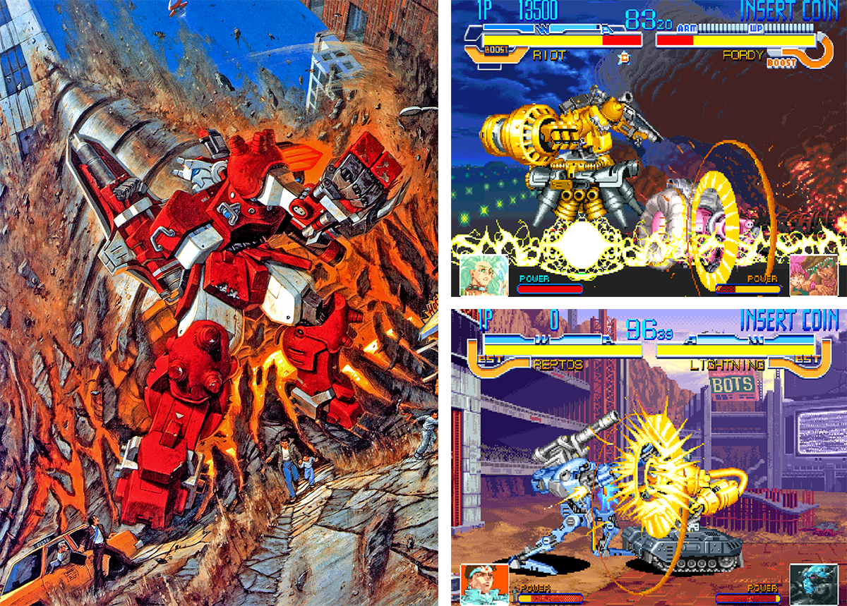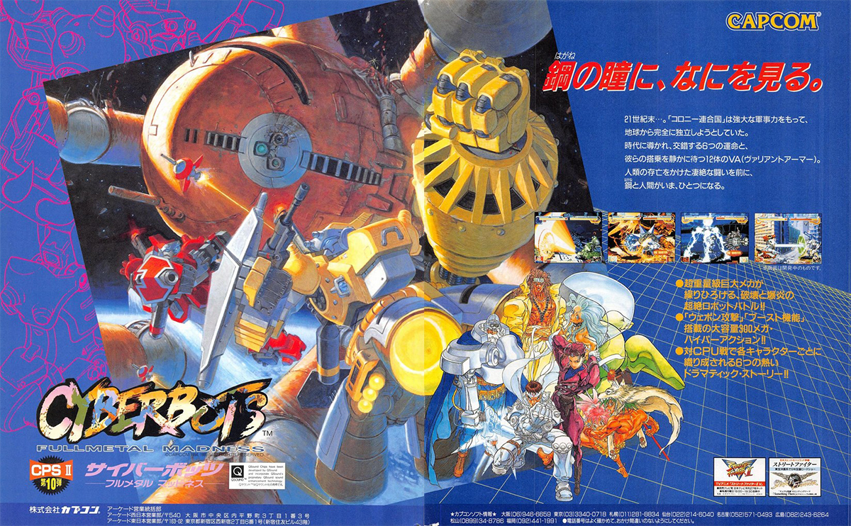 Debutto: ArcadeA settembre è uscito Armored Warriors, un picchiaduro a scorrimento con degli affari grandi quanto villette che si sfondavano la cassa metallo-toracica. Poi è venuto X-Men: Children of the Atom, quindi Night Warriors: Darkstalkers’ Revenge a marzo. Ora, un mese dopo, è già tempo per un altro gioco che Capcom frulla attraverso la potenza della sua scheda CPS2. Cyberbots Full Metal Madness non è nemmeno un gioco qualsiasi, perché mantiene un collegamento con Armored Warriors, ma questa volta le villette si schierano una di fronte all’altra nella più tradizionale disposizione da picchiaduro a incontri (con il benestare dell’assessore all’urbanistica di Osaka).