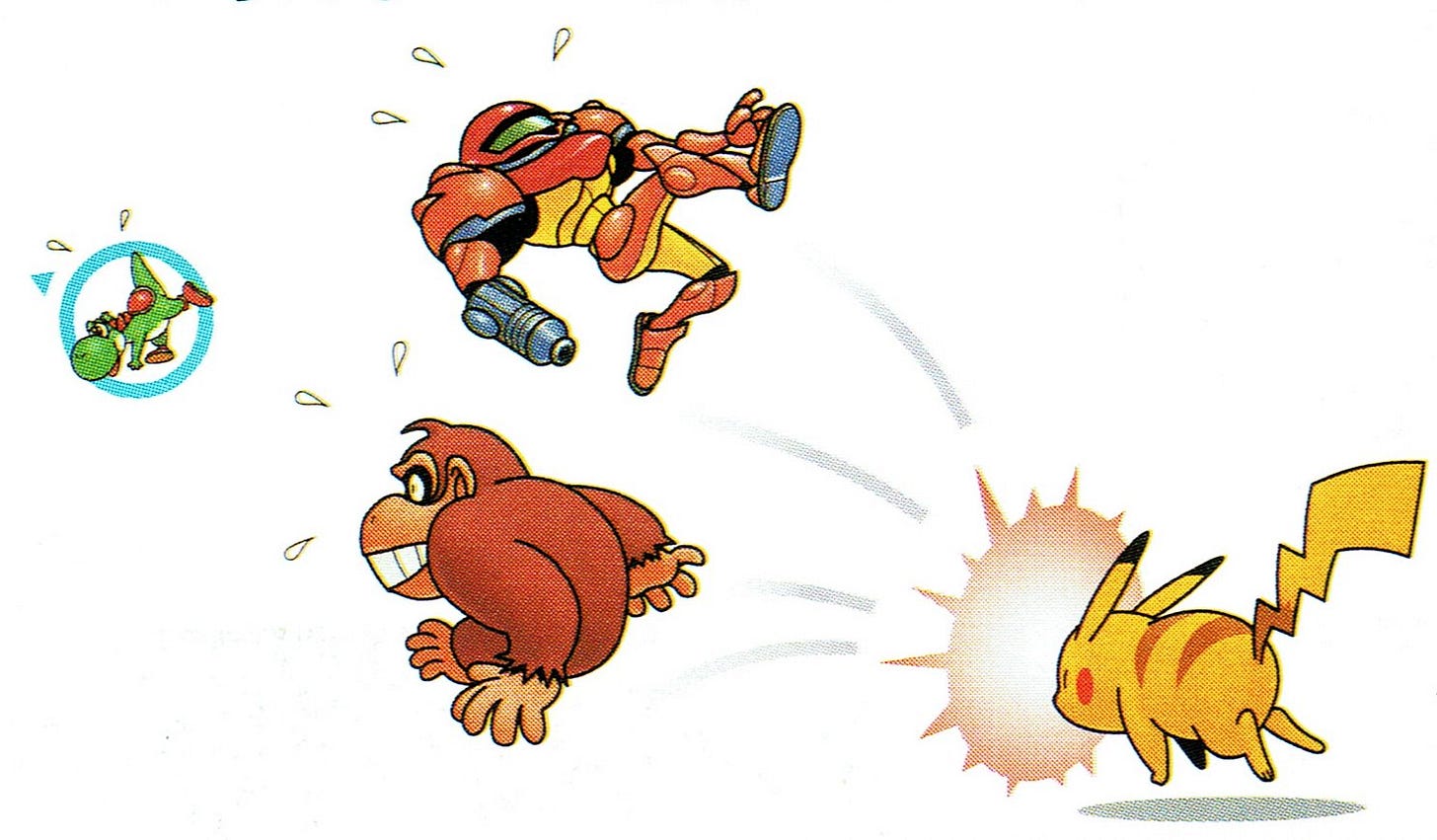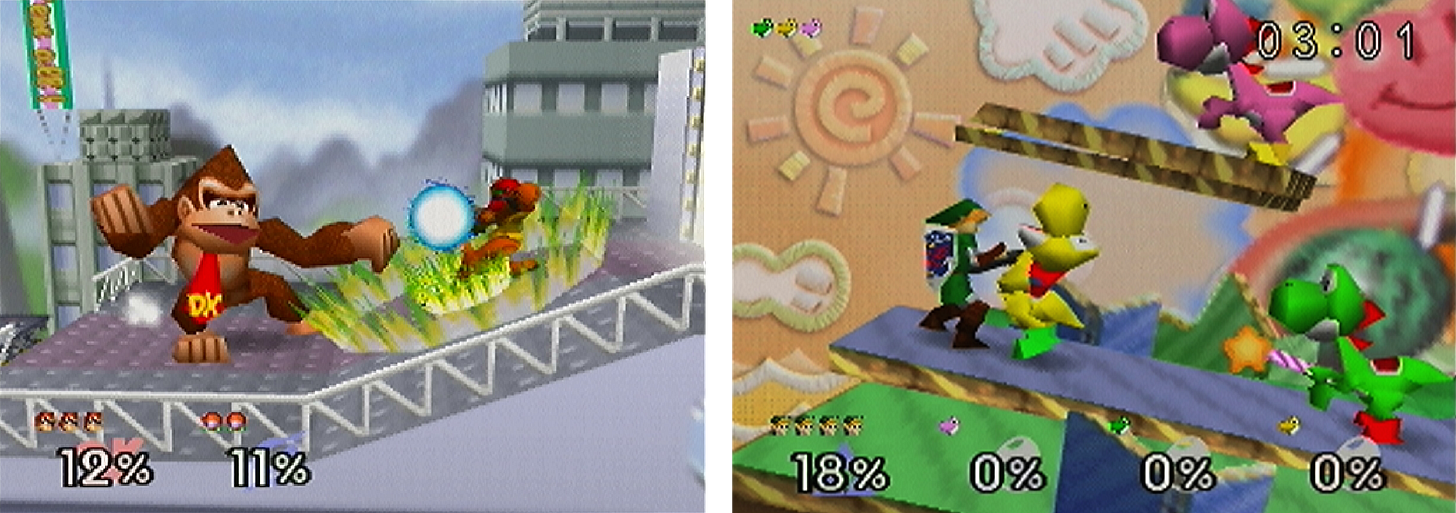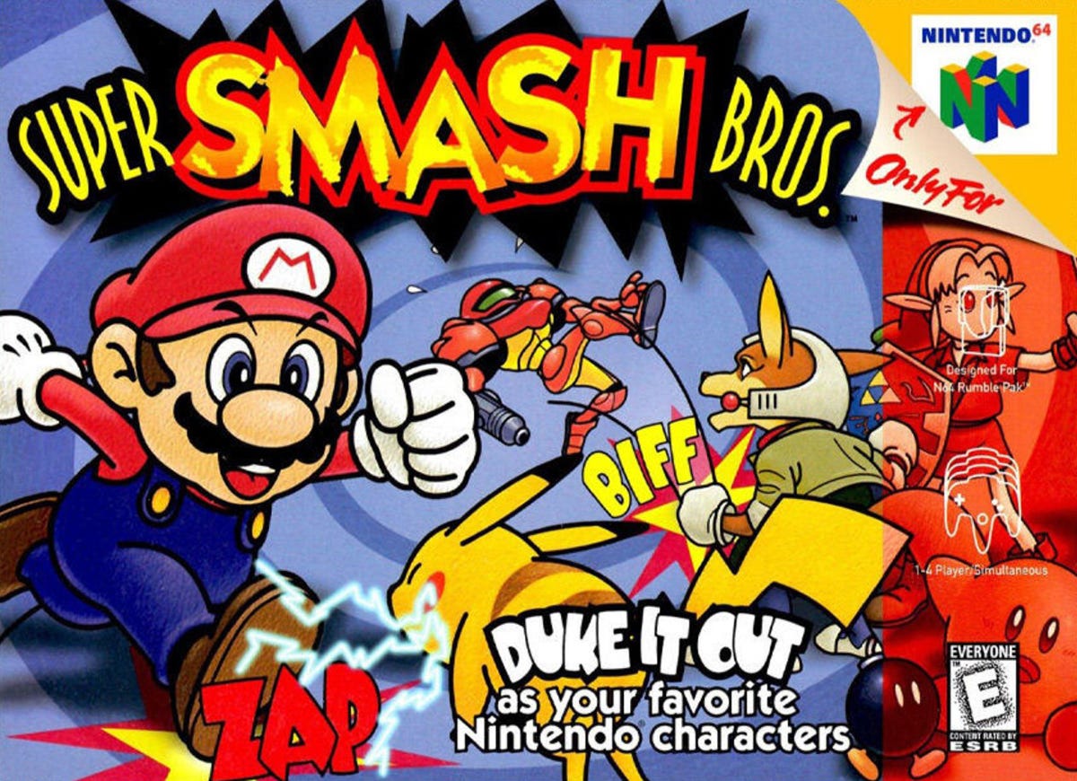 Dodici personaggi del cosmo di Nintendo si danno battaglia in Super Smash Bros., il picchiaduro creato da HAL Laboratory. Mario, Link, Zelda, Samus Aran, Pikachu, Kirby, Donkey Kong, Falcon, Yoshi, Ness, Luigi e Jiglypuff compongono il roster di picchiatori improvvisati, che mettono in moto un gameplay del tutto differente da quello che accomuna i picchiaduro a incontri. I livelli ricordano quelli dell’originale Mario Bros. (1982), con piattaforme e ostacoli, e l’obiettivo finale è lanciare gli avversari fuori dall’area di gioco.