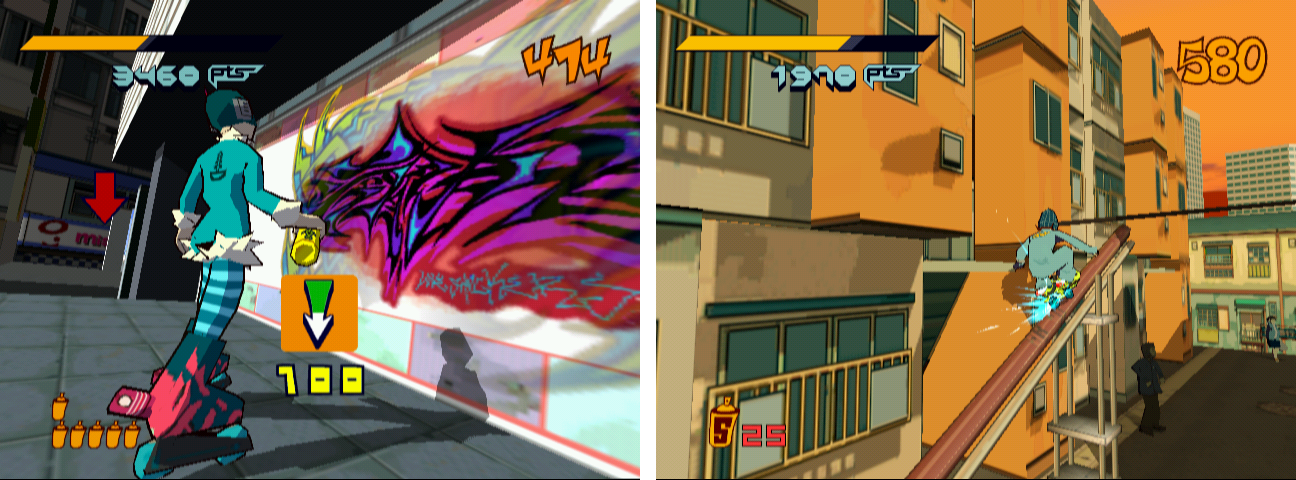 Debutto: Dreamcast (Sega)La copertina dell’edizione per il Giappone di Jet Set Radio è un caleidoscopio in cui il tratteggio di Beat, il “capitano” della squadra di protagonisti, si confonde con un mosaico di graffiti. Il disco di gioco, il GD-ROM per il Dreamcast, ha una grafica che lo fa assomigliare a un disco in vinile, un oggetto estremamente lontano dalla quotidianità dell’estate del 2000. Dentro, nella Tokyo-to raccontata dal DJ Professor K attraverso le frequenze della Jet Set Radio, si muove una crew che vive di musica hip hop dalle ampie influenze soul e funky, le cui giornata sono spese a pattinare e grindare, per raggiungere sempre nuove pareti da colorare con la propria tag/graffito.