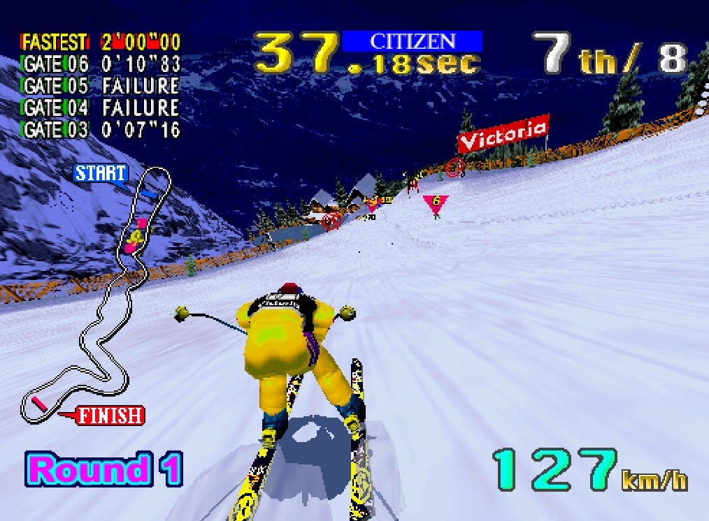 [WC] Possibile che Sega ne faccia passare una a Namco? Non serve rispondere. Ad Alpine Racer e seguito, quelli di Virtua Racing rispondono imburrando di sciolina un loro mobile da sala giochi che replica l’esperienza virtuale di sci alpino: è Sega Ski Super G. Anche questa volta ci sono bastoncini e sci su cui spostare il peso, con tre piste a livello di intensità e rischio di incidente crescente. La scheda Model 2 si fa carico di riprodurre sull’ampio monitor uno scenario da sogno (rimarchevole la neve non battuta a bordo pista che si alza in soffici spruzzate).