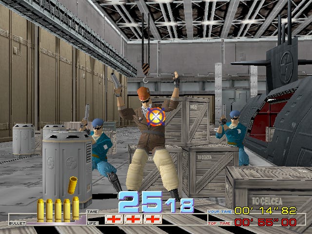 La tensione tra le fasi in cui volano le pallottole altrui e ci si accuccia da qualche parte per avere salva la pelle e quelle in cui si mette la testa fuori e si sfrutta l’estrema precisione della light gun per blastare tutto e tutti, crea un ritmo esaltante. Le situazioni in cui ci si viene a trovare sono tante e l’esuberanza tecnica è quella a cui Namco ci ha abituati.