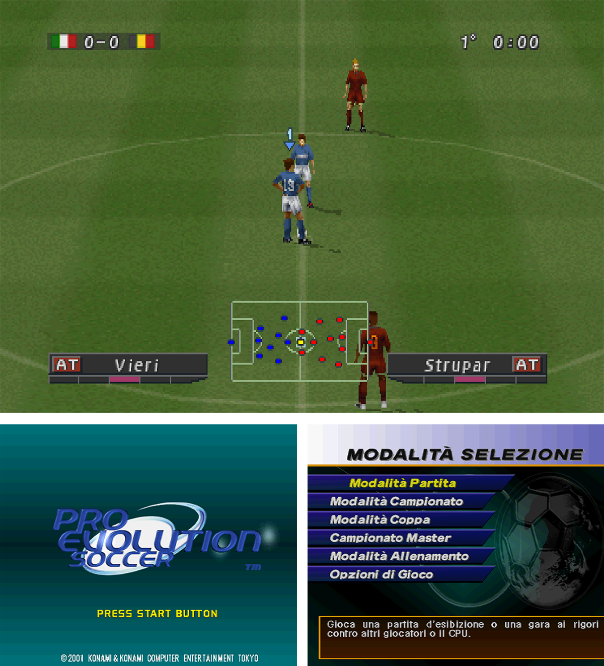 Debutto: PlayStation 2 (Sony)Anche sulla prima PlayStation, Pro Evolution Soccer è il miglior videogioco di calcio. Forse è la migliore simulazione sportiva. Secondo alcuni tra amici e cugini, Pro Evolution Soccer è il miglior videogioco e basta. Solo sulla prima PlayStation, però, Pro Evolution Soccer ha un problema: si guarda allo specchio e non si trova ringiovanito nemmeno di un giorno. È una sensazione di cui si può discutere solo con un videogioco, tantopiù con quelli che non escono mai di scena: anno dopo anno sono sempre lì. Dovrebbero essere più belli, più scattanti, più furbi e al contempo poter contare sull’esperienza accumulata. E invece Pro Evolution Soccer ha la copertina dell’edizione uscita sulla PlayStation 2, questa sì già proiettata nel futuro, ma secondo gli esami del sangue e del DNA, è rimasto tutto uguale all’anno prima, a ISS Pro Evolution 2. Il gioco, in effetti, è proprio lo stesso.