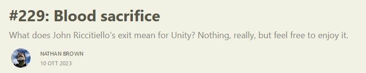 La puntata di un mese fa della newsletter di Nathan Brown si occupa della dipartita di John Riccitiello da Unity, dopo la complicata e fallimentare faccenda del nuovo modello di pagamento a cui avrebbero dovuto aderire gli sviluppatori. Con piglio inglese, Brown riassume un sentimento piuttosto diffuso in quei giorni, almeno tra chi i videogiochi li fa.