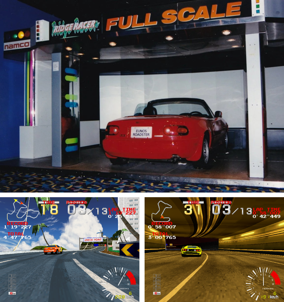 Ridge Racer illumina le sale giochi, anche con il suo enorme e spettacolare cabinato in versione Full Scale, una replica della Mazda MX-5 che viene posta di fronte a uno schermo largo tre metri. Naturalmente è prevista anche una postazione meno ingombrante. Namco presenta un gioco di guida tecnicamente all’avanguardia e lancia il guanto di sfida a Sega, il cui Virtua Racing non può contare sulle texture map che vestono i poligoni mossi dalla scheda System 22, l’hardware di Ridge Racer. Correre sui tre tracciati di Ridge Racer vi convincerà che il futuro è fatto di poligoni e una sensazione di velocità indescrivibile.