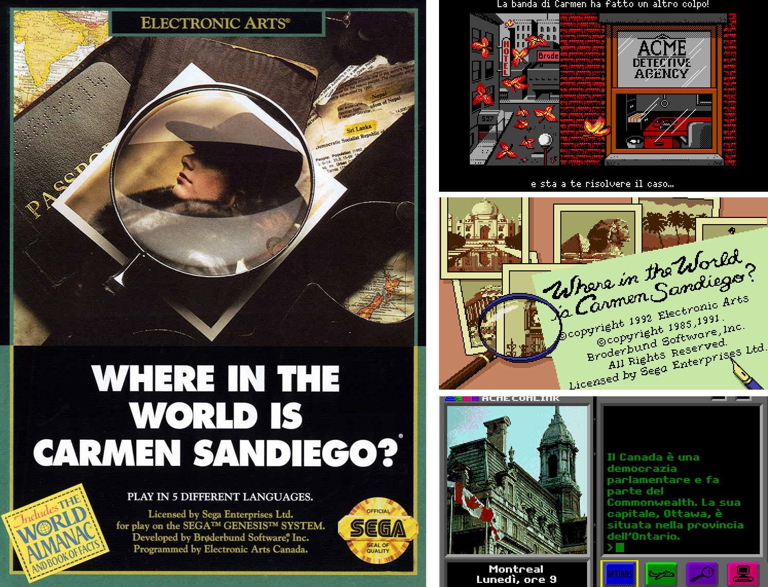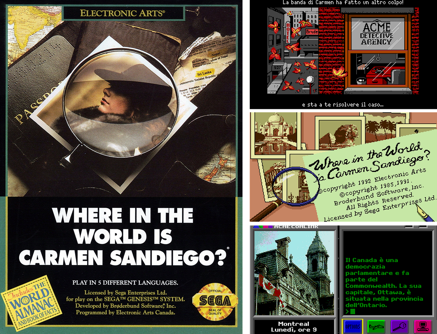 Assieme a una manciata di altri giochi, Where in the World is Carmen Sandiego? mi si fissò in testa in uno dei tanti momenti che ho passato a succhiare ogni possibile informazione da chissà quale numero di Electronic Gaming Monthly, lo storico mensile statunitense dedicato ai videogiochi. Avrò avuto circa dodici anni e quello che vedevo su “EGM” arrivava solo qualche mese più tardi sulle pagine delle riviste italiane. Nel caso in cui ci arrivasse, perché giochi come Where in the World is Carmen Sandiego? si fermavano al di là dell’oceano. Sia per quanto riguarda la distribuzione ufficiale, sia per l’informazione di settore. Peraltro l’edizione per l’Europa di Where in the World is Carmen Sandiego per il Mega Drive di Sega fu uno dei rari casi di videogioco tradotto in italiano su console dell’epoca a 16 bit.