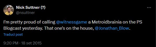In un episodio del podcast ufficiale di PlayStation1 del 2015 (!), Nick Suttner di Sony utilizzò il termine metroidbrania. L’intento era di inquadrare The Witness, un videogioco che sarebbe stato pubblicato all’inizio del 2016, realizzato da Jonathan Blow (già celebrato autore di Braid, 2008).