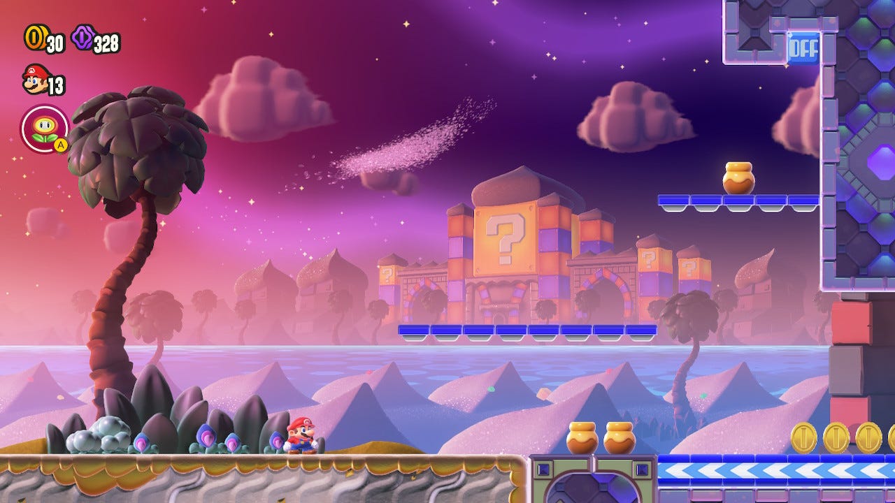 in questa newsletter mi è già successo di scrivere delle recensioni degli altri. Questa volta, invece, l’argomento è una mia recensione, quella di Super Mario Bros. Wonder. Non scrivo quasi mai di questioni che mi riguardano, perché mi dà abbastanza fastidio. C’è anche il rischio di passare per uno convintissimo di essere proprio tanto, tanto importante, che mi dà ancora più fastidio. Però questa è la mia newsletter, c’è il mio nome qua in giro e uso addirittura la prima persona singolare. Insomma, mi arrendo alla realtà dei fatti: c’è la possibilità che ti interessi davvero quello che ho da dire, anche se mi riguarda direttamente. Allora in questa puntata spiego perché ho scritto un’altra recensione di un altro gioco di Mario, come ho provato a farlo e perché ho provato a farlo in questo modo.