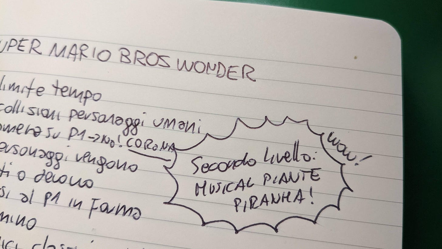 Anche per Super Mario Bros. Wonder mi sono segnato qualcosa, ma a essere sinceri è proprio poco. Di norma, quello che scrivo mi serve per avere un po’ di ordine mentale, soprattutto nelle prime partite, quando sono aggredito da mille cose che vedo succedere sullo schermo. Nel caso di Super Mario Bros. Wonder sono anche più di mille. Tra gli appunti di Super Mario Bros. Wonder ce n’è uno sul secondo livello del gioco, “Musical delle piante piranha”, e sopra c’è anche un piccolo “wow”. Poi, incredibilmente, questa cosa l’ho usata nella recensione come esempio di ciò che rende grande il gioco.