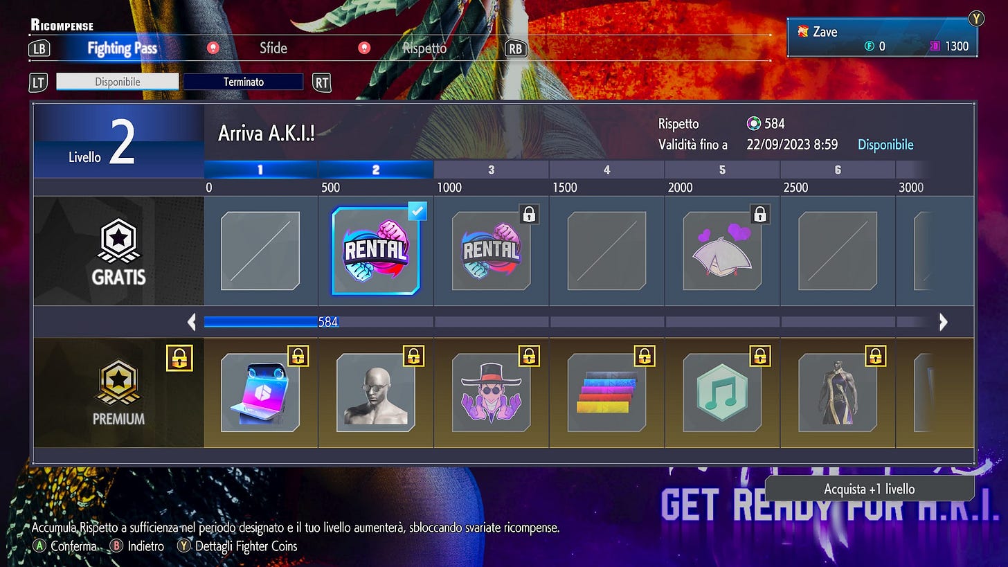 Queste soluzioni non vanno confuse con i Season Pass o equivalenti, che sono invece pacchetti di contenuti di maggior rilevanza, come fasi, modalità, personaggi o ambientazioni aggiuntive, rispetto a quanto incluso nel gioco “base”. Elementi che vengono resi accessibili direttamente dopo l’acquisto del pass, a patto che quel contenuto sia già stato reso disponibile dall’editore. Quello che finisce nei Season Pass rimane di norma acquistabile sempre e comunque, sia singolarmente che all’interno dei Season Pass (la disponibilità dei contenuti digitali meriterebbe un discorso molto più lungo). Nel caso dei picchiaduro a incontri, i Season Pass sono solitamente composti da qualche personaggio extra, da colori e costumi in più anche per i combattenti già inseriti nel gioco standard e da arene nuove. Tutto viene distribuito nei mesi successivi al lancio del gioco.