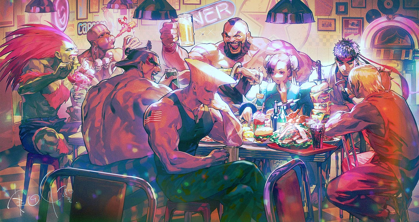 qualche giorno fa ho finito Street Fighter 6. Cioè, intendo dire che ho finito la modalità Arcade. Con un solo personaggio. A livello di difficoltà standard. Un tempo mi sarei vergognato all’idea di diffondere pubblicamente i dettagli della mia pochezza, ma mio figlio oggi ha iniziato la prima elementare e i tempi dell’amor proprio sono sepolti chissà dove. Nonostante questo non posso fare a meno di provare ogni nuovo episodio di Street Fighter, anche se gli anni in cui mi ci dedicavo anima e corpo sono ormai consegnati alla storia e, anzi, posso dire che sia successo per davvero solo con Street Fighter II. Forse perché poi, poco per volta e come succede quasi sempre (quasi), anche Street Fighter è andato complicandosi e aggiungendo meccanismi e sovrastrutture. Che cos’è oggi Street Fighter 6 o qualsiasi altro picchiaduro, tra i grandi nomi sopravvissuti al periodo d’oro degli anni Novanta? Quale è il pubblico che hanno in testa Capcom (Street Fighter), NetherRealm (Mortal Kombat) e ArcSystem (Guilty Gear) quando preparano i loro giochi? E come bisognerebbe parlare a quel pubblico? Di carne al fuoco ce n’è e non penso che riuscirò a esaurire l’argomento in una sola puntata, ma vediamo come va.
