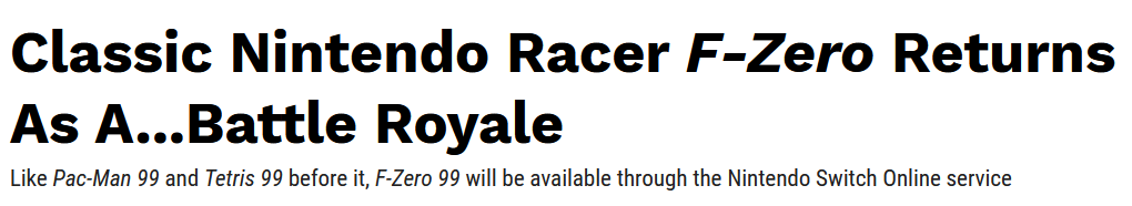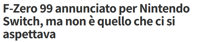 Mentre leggevo un po’ di quanto scritto riguardo a F-Zero 99, mi sono ritrovato di fronte anche a delle semplici notizie che riescono a descrivere il gioco in maniera più entusiasta di quanto non faccia Nintendo (potete controllare da voi: questo è il link alla scheda di F-Zero 99 sul sito ufficiale). È interessante segnalare la cosa, perché spiega una parte dei problemi di come si scrivono le notizie che riguardano i videogiochi in Italia.