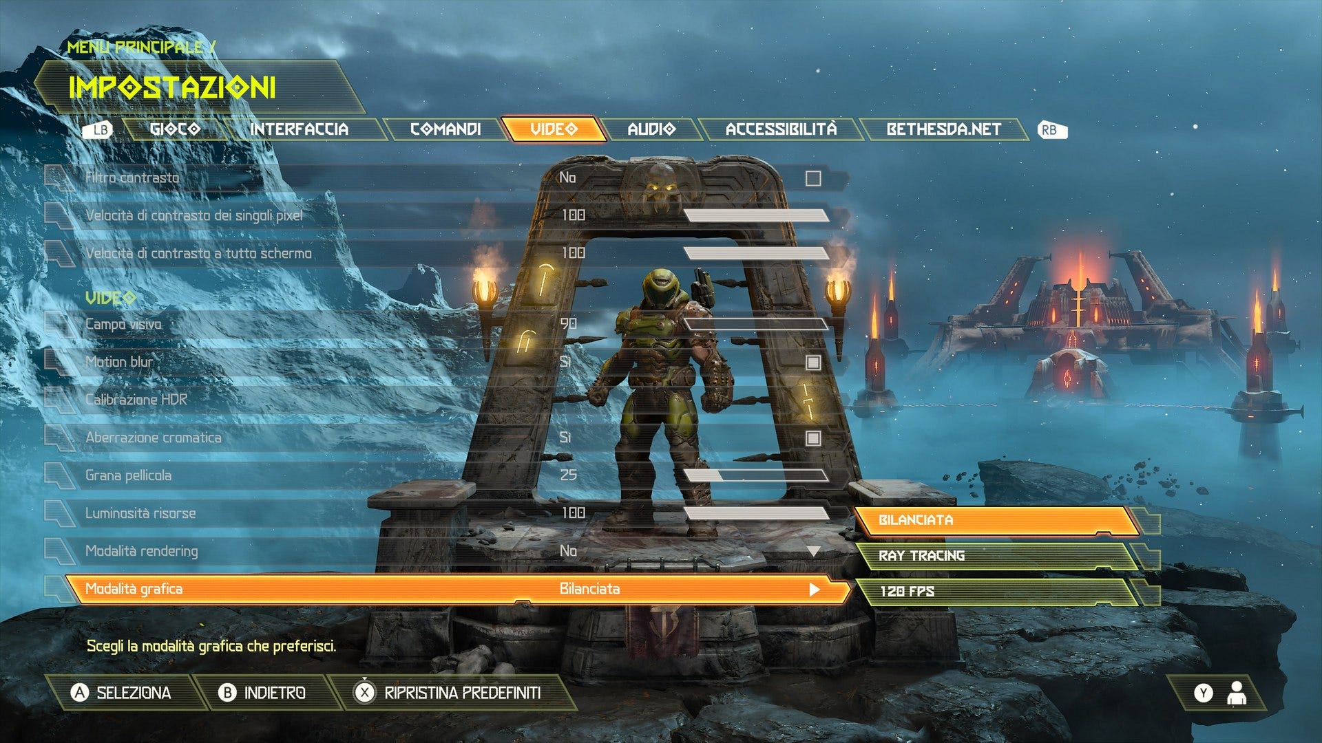 Di nuovo Bethesda, questa volta con quel mastino di Doom Eternal (id Software, 2020). id Software prova a rendere vagamente più chiare le scelte relative alla modalità grafica a disposizione: ne abbiamo una bilanciata, dove gli elementi sulla bilancia sono la risoluzione e il frame rate, una che predilige l’effetto Ray tracing e una che punta addirittura su 120 frame al secondo, il massimo raggiungibile su console come PS5 e Xbox Series X (solo se si utilizzano specifici televisori).