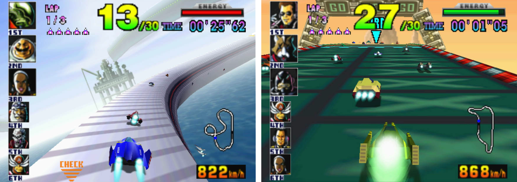 Esteticamente i tracciati ricordano in qualcosa l’effetto del Mode 7 di F-Zero, ma nella nuova versione a 64-bit curvano, si avvitano e piegano su loro stesse e nella terza dimensione a una tale velocità, che è facile perdonare la mancanza di dettaglio degli ambienti e l’effetto della nebbia all’orizzonte. Ci sono ovviamente dei motivi alla base del look molto essenziale, blando, dei tracciati: su schermo ci sono 30 vetture, tutte assieme, a sessanta frame al secondo. Sì, 30 vetture, ciascuna si composta a modo suo e affronta le sue curve, sbatte contro le altre e accelera per levarsi dai guai. La sensazione che si ha quando si passa su un acceleratore e si taglia in due un gruppo di 15 avversari, è esaltante. Va ammirata la filosofia di Nintendo, che l’ha portata a produrre un gioco che esteticamente sembra fuori tempo massimo, ma solo se ci si limita alle immagini: è in movimento che mostra le sue qualità. È quasi come se Nintendo avesse cercato di distillare l’essenza dei giochi di corse: velocità massima, controllo totale e fuori tutto quello che potrebbe mettersi nel mezzo.