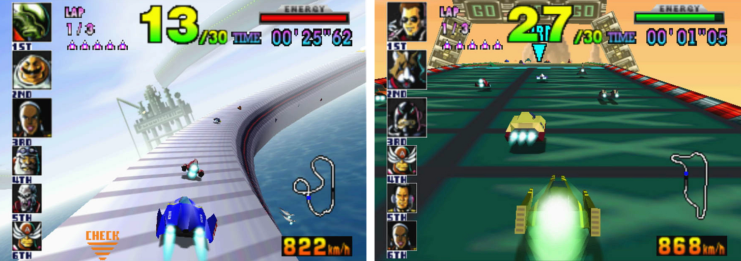 F-Zero X è la corsa competitiva ridotta ai suoi minimi termini: velocità, controllo rigorosissimo e pericolo costante. Le piste non sono piste in effetti, ma più che altro dei piani astratti con giri della morte e spirali, tutto sospeso nello spazio. I concorrenti non hanno veicoli ultradettagliati con murate di statistiche e opzioni per la personalizzazione. Sono però dei veicoli che si muovono fulminei a pochi centimetri da terra, realizzati solo da pochi poligoni. L’estetica è spartana, il gameplay crudele. È l’essenza stessa del videogioco di corse.