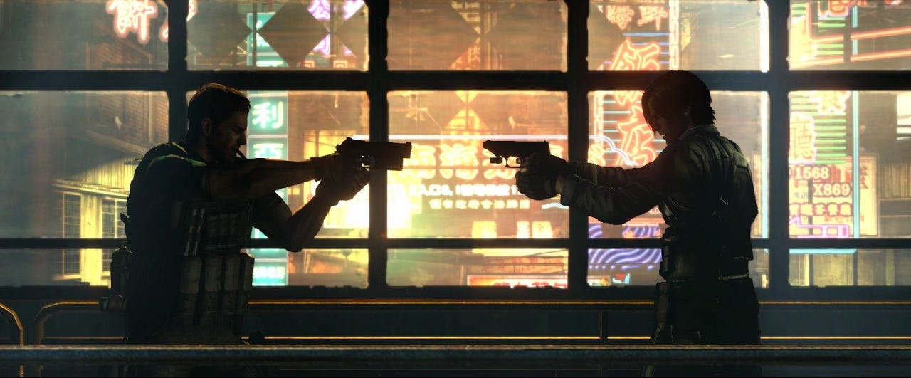 […] Quando abbiamo iniziato a lavorare al gioco, avevo in mente un’immagine: Chris e Leon che si puntano le pistole addosso. Sarebbe stato un bel momento e volevo che ci fosse, ma non sapevo nemmeno a che punto della storia sarebbe potuto succedere. Sapevo solo che era troppo bello e lo volevo, ma come fare a giustificarlo? Come costruirci una storia interessante attorno, aggiungendo degli elementi horror che la faccia funzionare?
