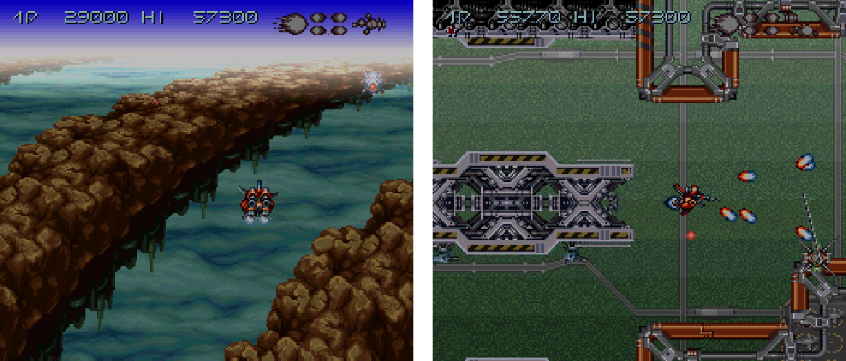 Debutto: Super NES, 11 settembre 1992 | Velivolo: D117BAxelay sceglie di non scegliere: scrolling verticale od orizzontale? Tutti e due, grazie! La voglia di Konami è di produrre uno dei primi grandi sparatutto pensati in maniera specifica per le possibilità del Super NES. Axelay parte con la nave D117B che punta a tutto ciò che scorre verso di lei dall’alto, mentre il Mode 7 crea l’illusione della curva dell’orizzonte, che srotola come un tappeto. Intontiti dall’effetto si può rimanere alla mercé del nemico, che non si fa pregare: ogni colpo andato a segno disinstalla dall’aeronave una delle tre armi, lasciandola nuda come un Ciao della Piaggio (e altrettanto resistente al successivo proiettile o raggio laser).