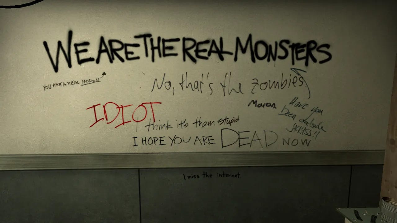 Nathan Grayson su Aftermath scrive un bel pezzo su Left 4 Dead e più nello specifico sul perché le scritte sui muri siano così significative pur essendo un elemento totalmente accessorio del gioco. Qual è questo perché? Sono state scritte da esseri umani, e non dall’AI. Sembra un azzardo, lo capisco, ma sono proprio queste piccole cose che sembrano inutili a dare un’anima alle cose.