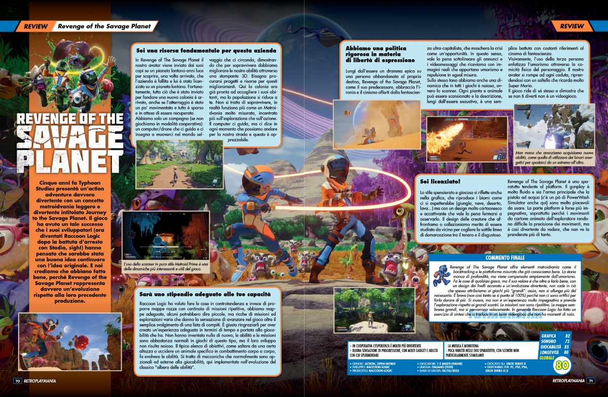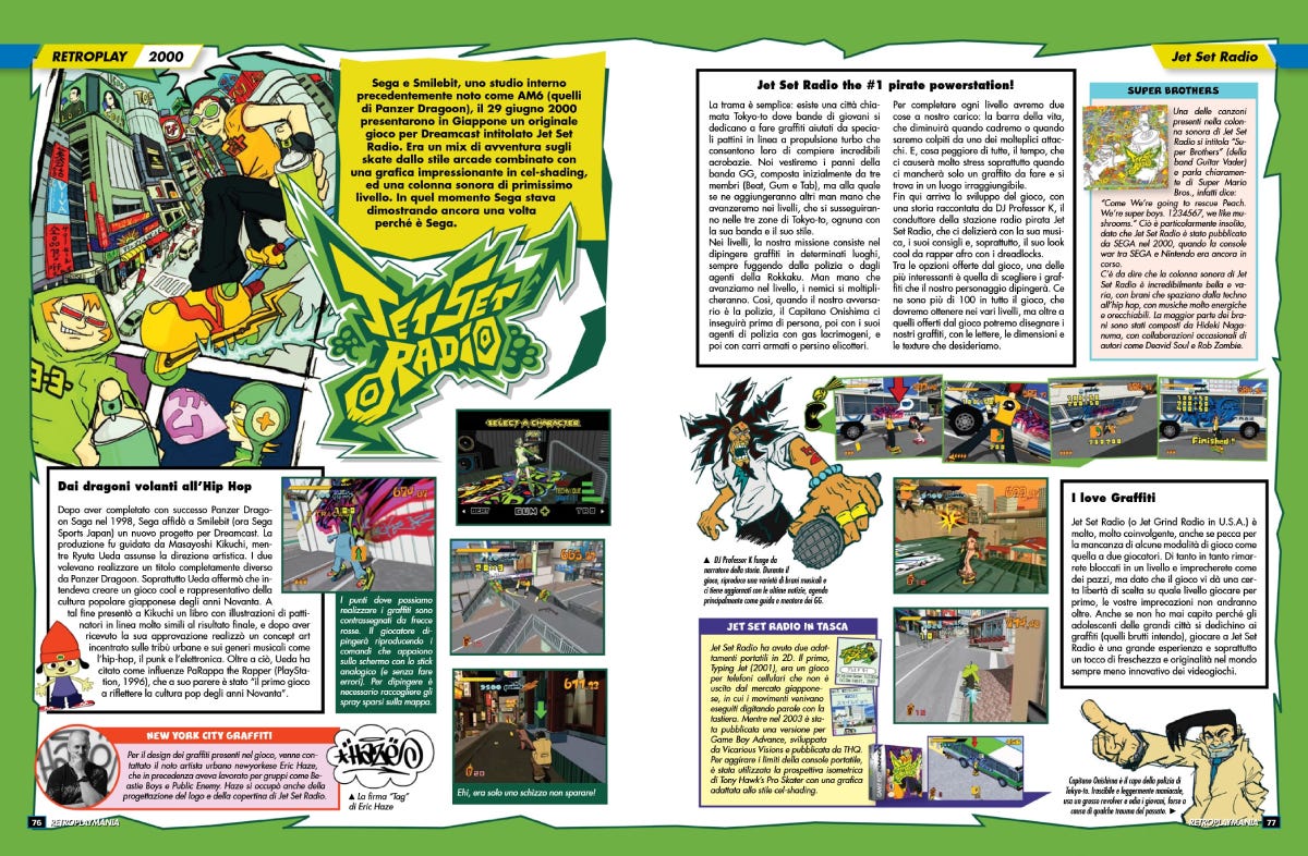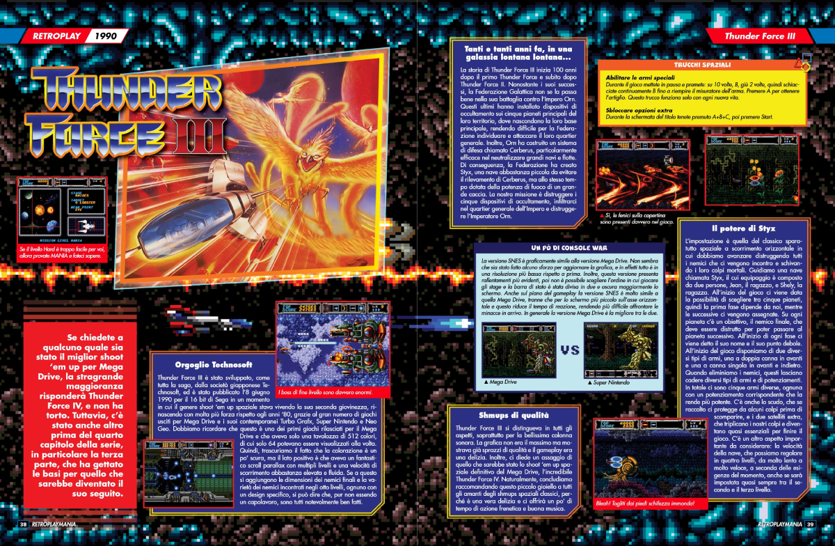 Il vestito di RetroplayMania è la sua parte immediatamente più interessante e piacevole. Da essere umano che è cresciuto con l’abitudine di leggere riviste, soprattutto di videogiochi, sfogliare RetroplayMania è stata un’esperienza piacevole e rassicurante. L’impostazione grafica segue in effetti lo stile di quelle citate da Prete e, più in generale, delle pubblicazioni di settore degli anni Novanta. Le pagine hanno nella maggior parte dei casi un fondino colorato e sono ravvivate da molti riquadri con testi brevi, immagini di gioco o illustrazioni. Ci sono le schede con le informazioni essenziali, c’è la pagella con i voti assegnati alle categorie più tradizionali (grafica, sonoro, giocabilità e longevità) e accompagnata da un commento esteso dell’autore dell’articolo.