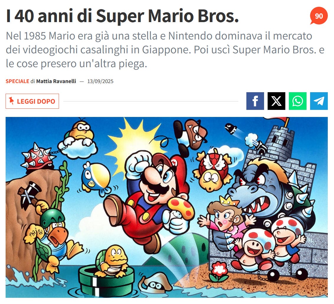 Per Multiplayer ho scritto un articolo sui primi quarant’anni di Super Mario Bros. L’hanno fatto tutti (compreso chi forse avrebbe dovuto evitare), potevo non farlo io che ho un problema di incontinenza editoriale? L’articolo è questo.