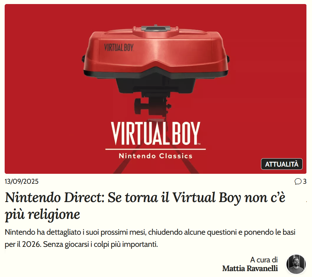 Per Final Round ho riassunto e commentato gli annunci di Nintendo del 12 settembre, a partire dal sorprendente (o forse no) ritorno del Virtual Boy. Poi però si parla anche di Metroid Prime 4: Beyond, del costo dei DLC, di Mario Tennis Fever e della capacità di arrivare a fine stagione senza fare i salti mortali. Sta tutto qui.