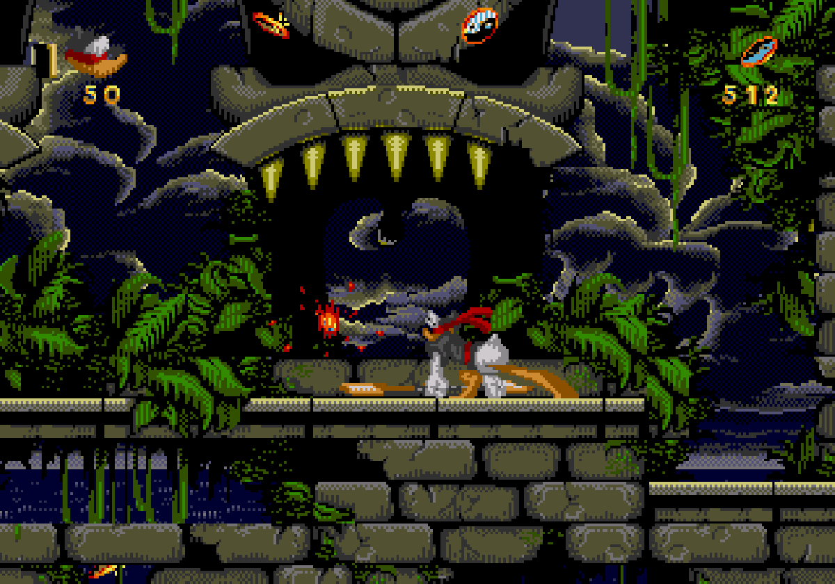 La parte migliore di Paperino in Cold Shadow è quella che finisce sotto al naso dei giocatori e cioè il suo vestito. Le animazioni dell’eroe dai piedi palmati sono eccellenti, anche se troppo spesso sconnesse tra di loro e facili al bisticcio con le piattaforme e gli altri elementi. La qualità non è una sorpresa, perché dietro c’è John Fiorito, già Lead Artist della versione di Virgin di Aladdin e di The Lion King sul Super NES. Nel gioco Paperino si trasforma nell’alter ego che compare nel titolo internazionale: un ninja che attacca con un bastone lungo così.